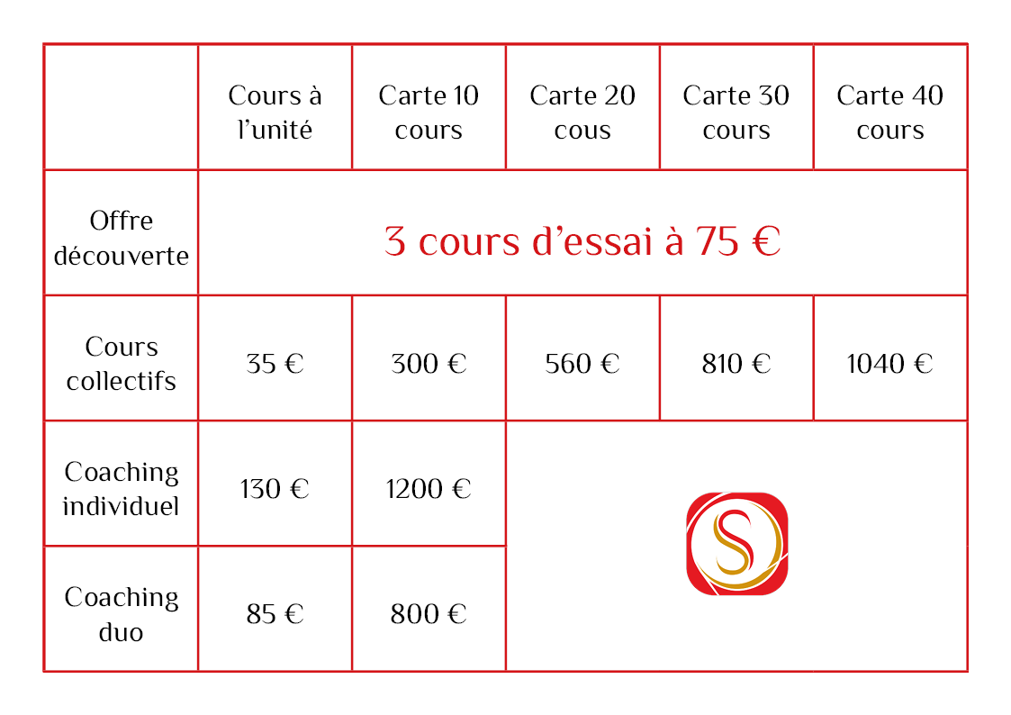 Avec l’offre découverte à 75 € les 3 cours, vous bénéficiez d’un tarif réduit pour débuter.